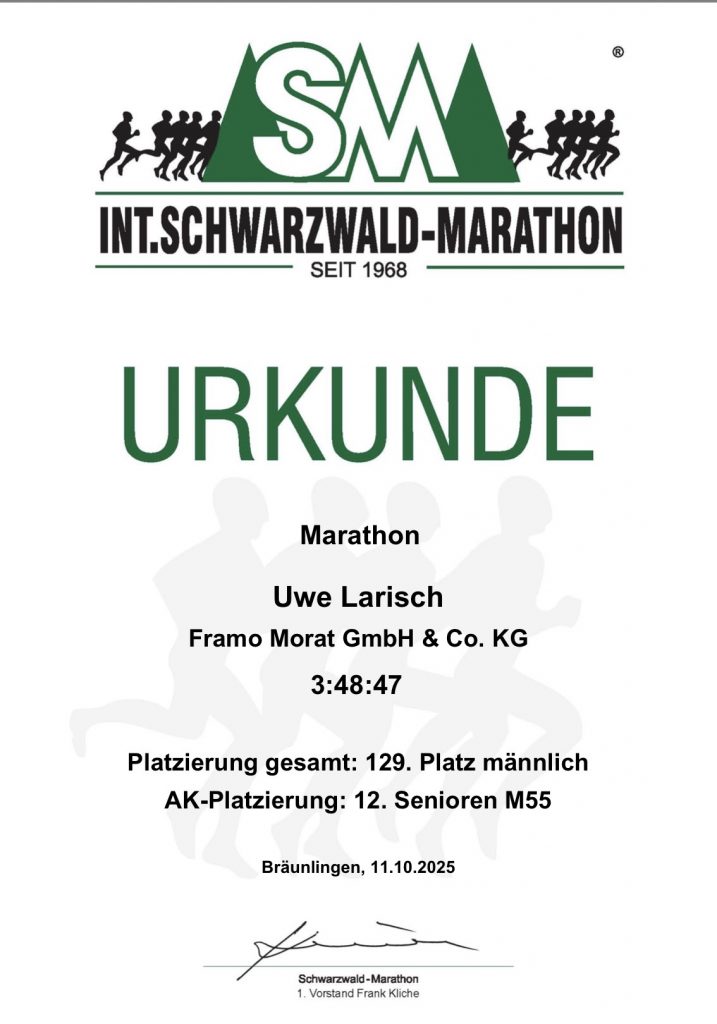 Der Schwarzwald-Marathon ist als weltältester Natur- und Frauenmarathon eine Legende und weit über die Grenzen Europas hinaus bekannt. Ein Kunde hat mich gefragt, ob ich mal teilnehmen will. Dieses Jahr klappt es. Ich freue mich auf diesen geschichtsträchtigen Lauf. Zur Vorbereitung nahm ich am 21.09.2025 am Baden-Marathon in Karlsruhe teil. Mit 3 Stunden 52 Minuten habe ich hier meine Zielzeit unter 4 Stunden erreicht. Diese brauchte ich noch, um die Teilnahmebedingung für den Polarnacht-Marathon in Tromsø zu erreichen. Nun beginnen dafür die Vorbereitungsläufe. Am 12. Oktober ist der Schwarzwaldmarathon ein schöner Teil davon.